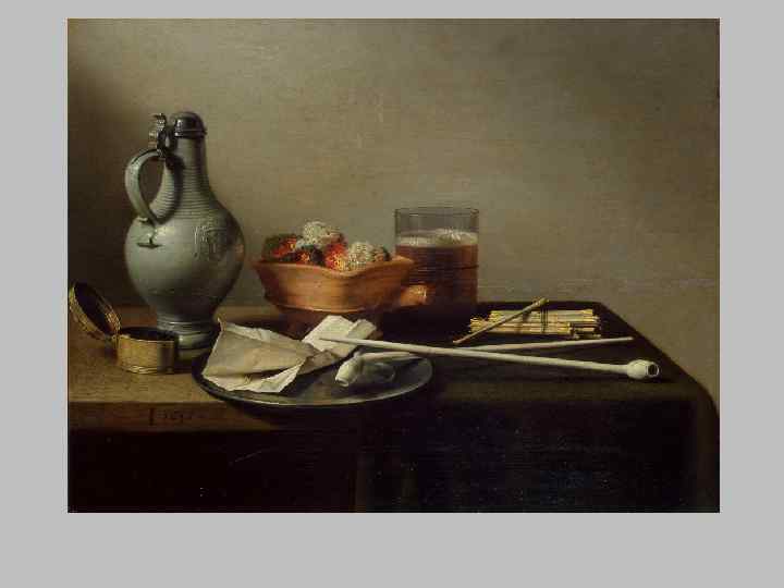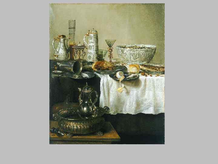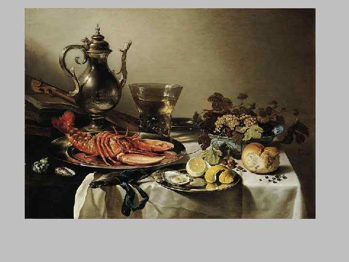 Натюрморт 1. Завтрак —изображает накрытый стол с яствами и посудой. «Живописный» беспорядок в расположение вещей и атмосфера уютного жилого интерьера, достигнутого передачей световоздушной среды, хранят следы присутствия человека. 2. Цветочный натюрморт – становится популярным благодаря традиции иметь сады, загородные виллы или комнатные растения, а также в благоприятных природных условиях для развития цветоводства. 3. Ученый натюрморт - является наиболее интеллектуальным видом натюрморта, требующим от зрителя знания Библии и традиций религиозной символики Часто в натюрмортах присутствуют приемы, создающие искусный обман зрения. Это привело к возникновению особого вида натюрморта — «обманок» 4. Ванитас ( «суета-сует» ) – разновидность ученого натюрморта