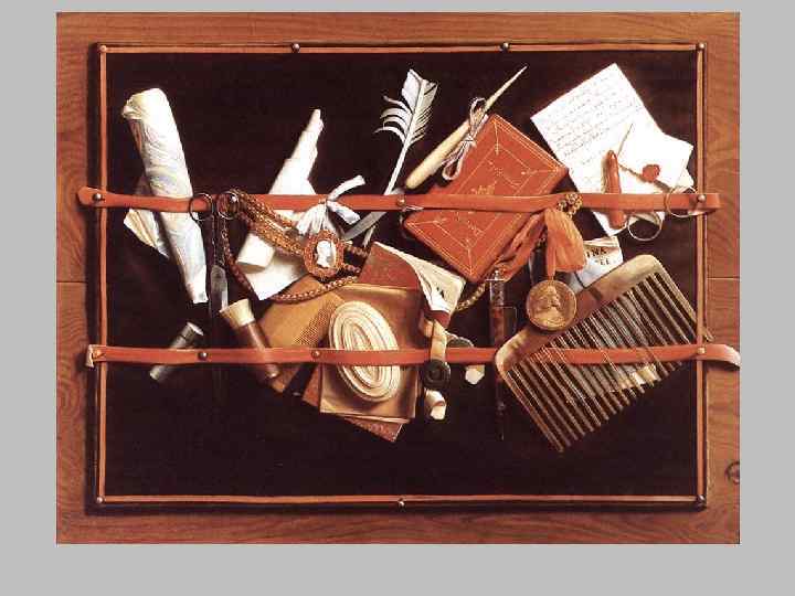 Хогстратен получил в Вене от императора Фердинанда III золотую медаль за натюрморты-обманки. В этой картине мы видим императорскую медаль. Письмо, кожаный журнал и книга указывают на литературную деятельность Хогстратена. Античные камеи и большой черепаховый гребень говорят о богатстве и высоком социальном положении.