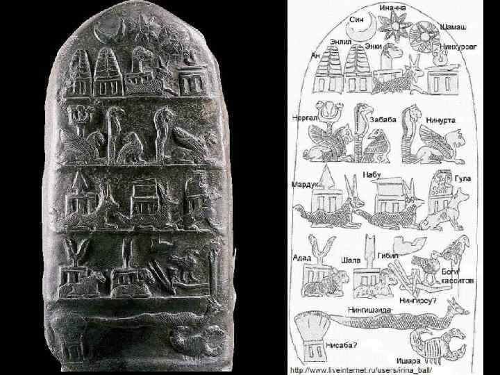 Кудурру/ нару Мели-Шиху(Мелишпака). 12 в. до н. э. Лувр 1 -й ряд: полумесяц - Син, звезда - Иштар, солнечный диск - Шамаш, ниже - рогатая тиара на алтаре - Ану, вторая рогатая тиара - Энлиль, баран и рыбо-козёл - Энки (Эйя), пуповина (? ) и нож на алтаре - богиня-мать (Нинхурсаг? ). 2 -й ряд: символы божеств войны и под земного мира: крылатый лев и дубинка с двумя пантерами - Нергал, коршун и кривой нож (? ) - Забаба, грифон, и кривой нож (? ) - Нинурта. 3 -й ряд: копьё на драконе - Мардук, доска с грифелем на алтаре - Набу, собака - Гула. 4 -й ряд: бык и молния на алтаре - Адад, ножницы. (? ) и баран - не расшифровано, светильник - Нуску, плуг - Нингирсу, птицы -возможно, касситское божество Шукамуна и его супруга Шамалия (? ). 5 -й ряд: сноп (? ), возможно, символ Нисабы, рогатый змей - Нингишзида, скорпион - возможно, Ишхара.