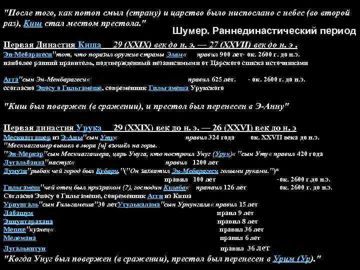 "После того, как потоп смыл (страну) и царство было ниспослано с небес (во второй раз), Киш стал местом престола. " Шумер. Раннединастический период Первая Династия Киша 29 (XXIX) век до н. э. — 27 (XXVII) век до н. э. Эн-Мебарагеси"тот, что поразил оружие страны Элам « правил 900 лет- ок. 2600 г. до н. э. наиболее ранний правитель, подтвержденный независимыми от Царского списка источниками Агга"сын Эн-Менбарагеси « правил 625 лет. - ок. 2600 г. до н. э. cсогласно Эпосу о Гильгамеше, современник Гильгамеша Урукского "Киш был повержен (в сражении), и престол был перенесен в Э-Анну" Первая династия Урука 29 (XXIX) век до н. э. — 26 (XXVI) век до н. э Мескиаггашер из Э-Аны"сын Уту « правил 324 года ок. XXVII века до н. э. "Мескиаггашер вышел в моря [и] взошёл на горы. "Эн-Меркар"сын Мескиаггашера, царь Унуга, кто построил Унуг (Урук) « "сын Уту « правил 420 года Лугальбанда"пастух « правил 1200 лет Думузи"рыбак чей город был Кубари. "("Он захватил Эн-Мебарагеси голыми руками. ")* правил 100 лет -ок. 2600 г. до н. э. Гильгамеш"чей отец был призраком (? ), господин Кулаба « прапаил 126 лет ок. 2600 г. до н. э. Согласно Эпосу о Гильгамеше, современник Агги из Киша Урнунгаль"сын Гильгамеша"30 лет. Утулькалама"сын Урнунгаля « правил 15 лет Лабашум праил 9 лет Эннунтарахана правил 8 лет Мешхе"кузнец « правил 36 лет Мелемана правил 6 лет Лугалькитун правил 36 лет "Когда Унуг был повержен (в сражении), престол был перенесен в Урим (Ур). "