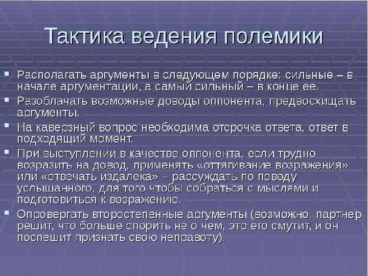 Общее о полемике Вместе с тем полемика существенно отличается от дискуссии. Если целью дискуссии являются прежде всего поиски общего согласия, того, что объединяет разные точки зрения, то основная задача полемики — утвержде ние одной из противостоящих позиций. Полемизирующие стороны менее, чем в дискуссии, ограничены в выборе средств спора, его стратегии и тактики. В полемике, как и в споре вообще, недопустимы не корректныеприёмы (подмена тезиса, аргумент к силе или к неве жеству, использование ложных и недоказанных аргументов и т. п. ). В полемике может применяться гораздо более широкий, чем в дискуссии, спектр корректных приёмов. Большое значение имеют, в частности, инициатива, навязывание своего сценария обсуждения темы, вне запность в использовании доводов, выбор наиболее удачного вре мени для изложения решающих аргументов и т. п.