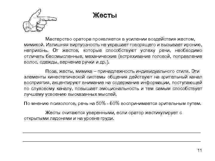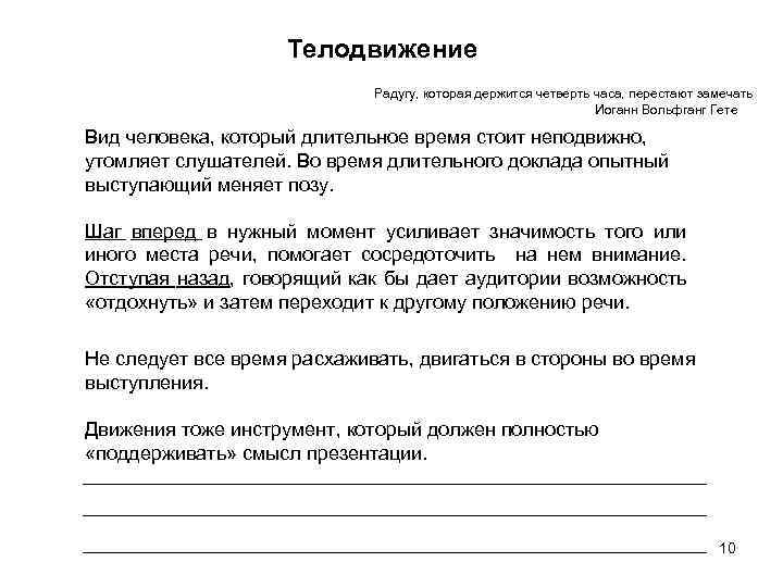 Телодвижение Радугу, которая держится четверть часа, перестают замечать Иоганн Вольфганг Гете Вид человека, который длительное время стоит неподвижно, утомляет слушателей. Во время длительного доклада опытный выступающий меняет позу. Шаг вперед в нужный момент усиливает значимость того или иного места речи, помогает сосредоточить на нем внимание. Отступая назад, говорящий как бы дает аудитории возможность «отдохнуть» и затем переходит к другому положению речи. Не следует все время расхаживать, двигаться в стороны во время выступления. Движения тоже инструмент, который должен полностью «поддерживать» смысл презентации. 10
