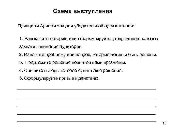 Схема выступления Принципы Аристотеля для убедительной аргументации: 1. Расскажите историю или сформулируйте утверждение, которое захватит внимание аудитории. 2. Изложите проблему или вопрос, которые должны быть решены. 3. Предложите решение поднятой вами проблемы. 4. Опишите выгоды которое сулит ваше решение. 5. Сформулируйте призыв к действию. 13
