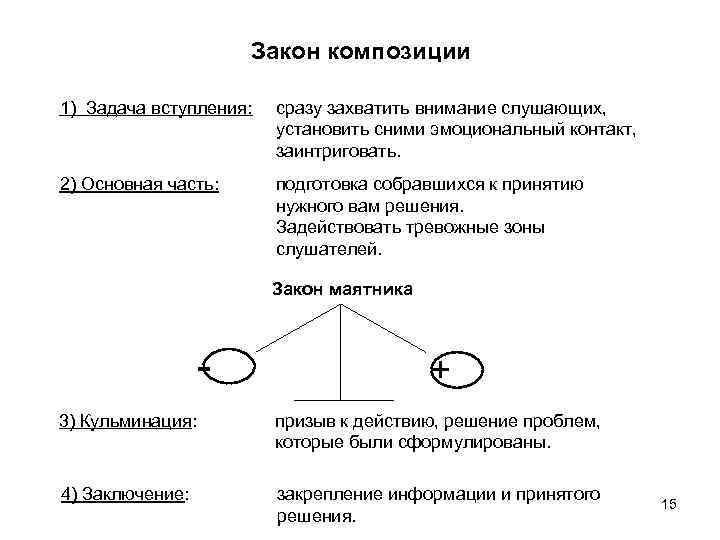 Закон композиции 1) Задача вступления: сразу захватить внимание слушающих, установить сними эмоциональный контакт, заинтриговать. 2) Основная часть: подготовка собравшихся к принятию нужного вам решения. Задействовать тревожные зоны слушателей. Закон маятника - + 3) Кульминация: призыв к действию, решение проблем, которые были сформулированы. 4) Заключение: закрепление информации и принятого 15 решения.