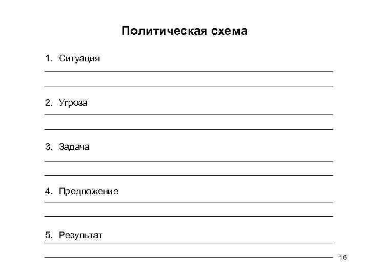 Политическая схема 1. Ситуация 2. Угроза 3. Задача 4. Предложение 5. Результат 16