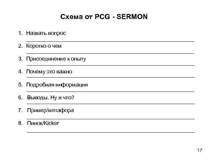 Схема от PCG - SERMON 1. Назвать вопрос 2. Коротко о чем 3. Присоединение к опыту 4. Почему это важно 5. Подробная информация 6. Выводы. Ну и что? 7. Пример/метафора 8. Пинок/Kicker 17