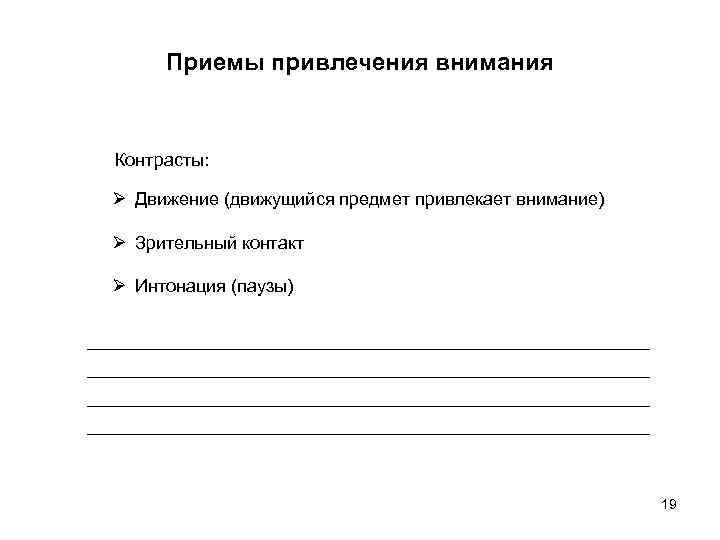 Приемы привлечения внимания Контрасты: Ø Движение (движущийся предмет привлекает внимание) Ø Зрительный контакт Ø Интонация (паузы) 19