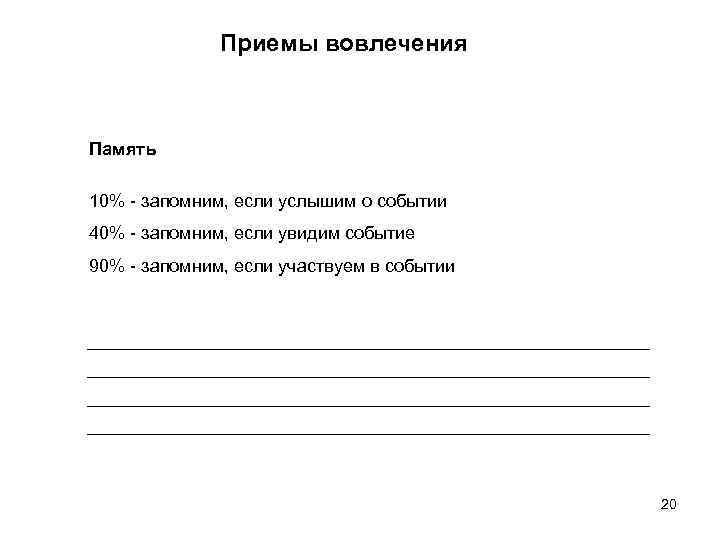 Приемы вовлечения Память 10% - запомним, если услышим о событии 40% - запомним, если увидим событие 90% - запомним, если участвуем в событии 20