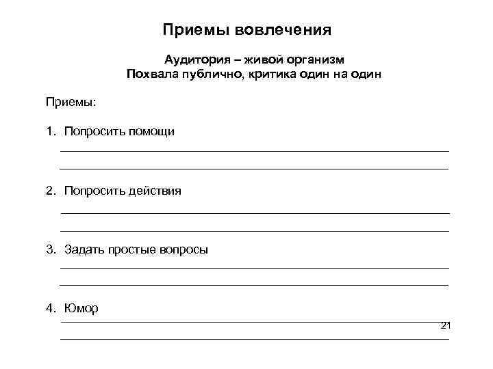 Приемы вовлечения Аудитория – живой организм Похвала публично, критика один на один Приемы: 1. Попросить помощи 2. Попросить действия 3. Задать простые вопросы 4. Юмор 21