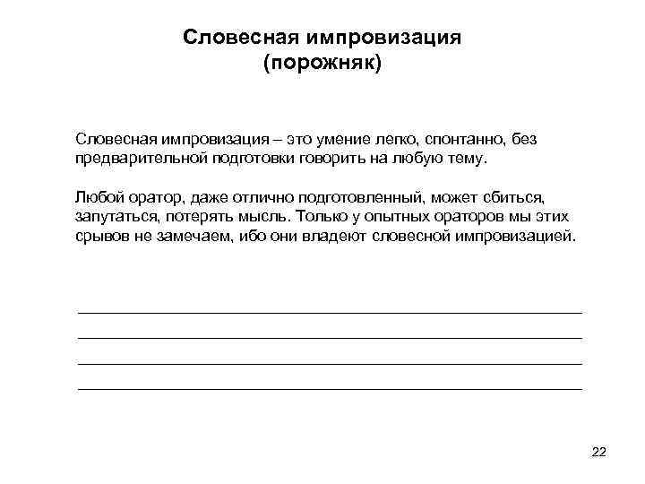 Словесная импровизация (порожняк) Словесная импровизация – это умение легко, спонтанно, без предварительной подготовки говорить на любую тему. Любой оратор, даже отлично подготовленный, может сбиться, запутаться, потерять мысль. Только у опытных ораторов мы этих срывов не замечаем, ибо они владеют словесной импровизацией. 22
