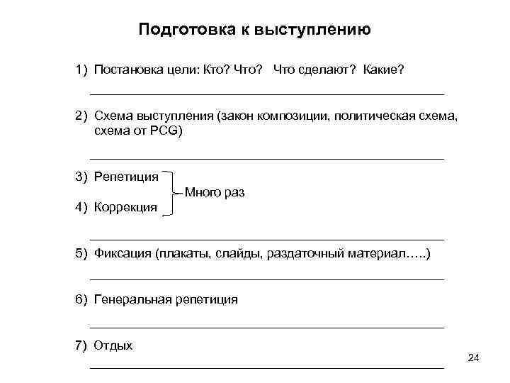 Подготовка к выступлению 1) Постановка цели: Кто? Что сделают? Какие? 2) Схема выступления (закон композиции, политическая схема, схема от PCG) 3) Репетиция Много раз 4) Коррекция 5) Фиксация (плакаты, слайды, раздаточный материал…. . ) 6) Генеральная репетиция 7) Отдых 24