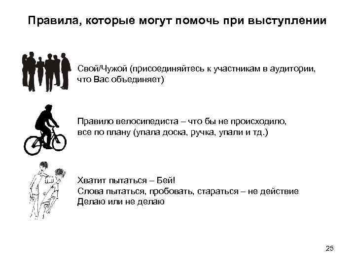 Правила, которые могут помочь при выступлении Свой/Чужой (присоединяйтесь к участникам в аудитории, что Вас объединяет) Правило велосипедиста – что бы не происходило, все по плану (упала доска, ручка, упали и тд. ) Хватит пытаться – Бей! Слова пытаться, пробовать, стараться – не действие Делаю или не делаю 25