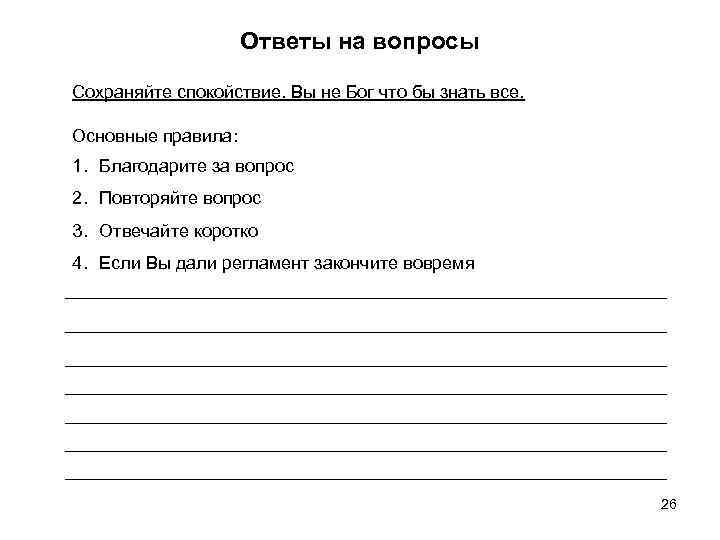 Ответы на вопросы Сохраняйте спокойствие. Вы не Бог что бы знать все. Основные правила: 1. Благодарите за вопрос 2. Повторяйте вопрос 3. Отвечайте коротко 4. Если Вы дали регламент закончите вовремя 26