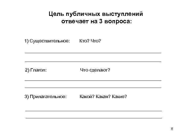 Цель публичных выступлений отвечает на 3 вопроса: 1) Существительное: Кто? Что? 2) Глагол: Что сделают? 3) Прилагательное: Какой? Какая? Какие? 6