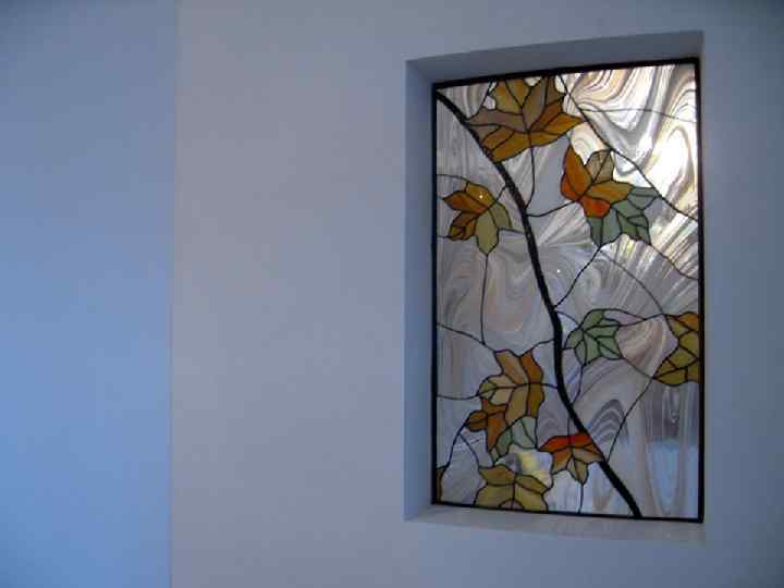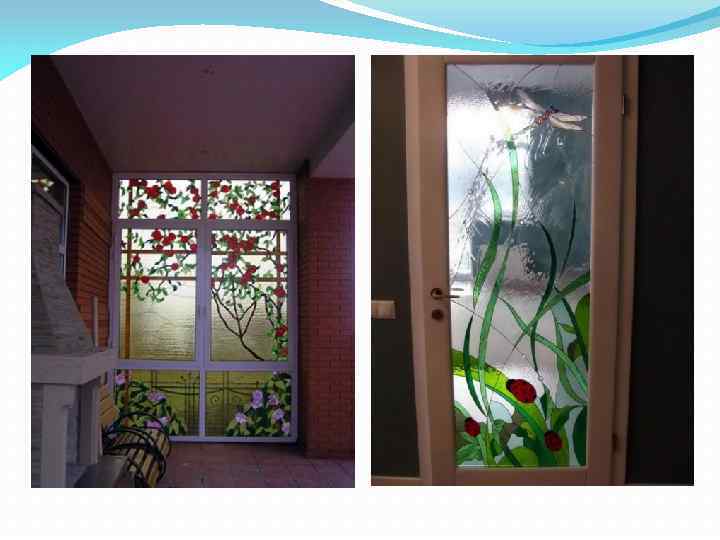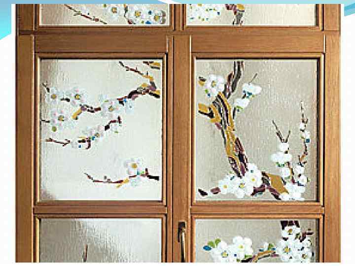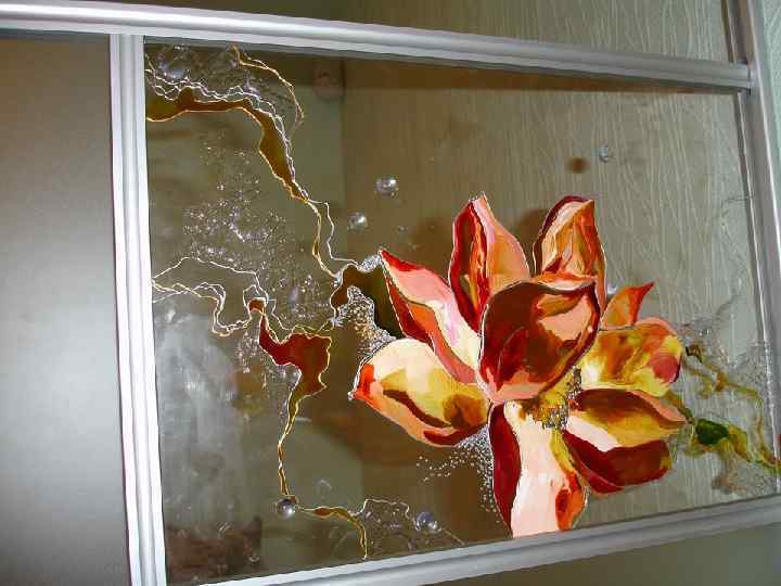 Расписной витраж (роспись по стеклу) Художественная роспись по стеклу выполняется специальными силикатными красками. Обычно расписываются детали в витражах. Использование только этой техники создает впечатление свежести акварели. Краски, после нанесения их на стекло, закрепляются в печи при высокой температуре, становясь при этом очень прочными и невосприимчивыми к выгоранию. Роспись по стеклу проста в исполнении, но достаточно красива и изящна, так как создает нежные, прозрачно-туманные образы. Это милое волшебство, по мнению дизайнеров, не останется незамеченным в интерьере вашей квартиры. При применении этой технологии витраж становится более дорогим, но в результате стекло выглядит по-настоящему элитным.
