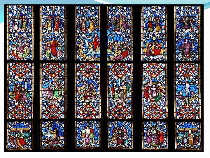 витраж Дерево Иессея, аббатство Сен-Дени; ок. 1140; Париж, Франция. Одна витражная панель в Средние века состояла часто из сотен кусочков стекла. Затем некоторые кусочки изымались и расписывались матовыми эмалевыми красками и повторно обжигались. Готовые кусочки скреплялись свинцовыми Н-образными полосками. Окна достигали высоты шести метров. Для прочности такие большие окна делили на панели меньшей площади, которые прикреплялись к расположенной снаружи металлической решетке. В эпоху Возрождения витражи в полной мере становятся картинами с реалистической передачей объема.