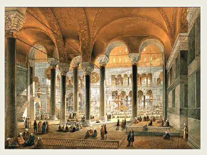 Храм св. Ирины в Константинополе (30 -е гг. 6 в. ). • Византийские строители были хорошими конструкторами, они успешно использовали и развивали технические достижения римской архитектуры. Наиболее важным элементом, появившимся в византийской архитектуре, стал барабан — цилиндрическая вставка между куполом и стенами, который позволил сохранить монолитность купола, устроив оконные проемы в стенах барабана. • Купол с барабаном — один из наиболее типичных знаков византийской архитектуры. Эта система в дальнейшем заимствуется различными архитектурами, по-новому интерпретируется и обогащается. • Строители восточных областей Римской империи вообще были более активны в поиске новых строительных приемов. Здесь очень часто строили центричные в плане сооружения и пробовали различные способы возведения сводов. Кроме этого типа был создан и тип купольной базилики, например храм св. Ирины в Константинополе.