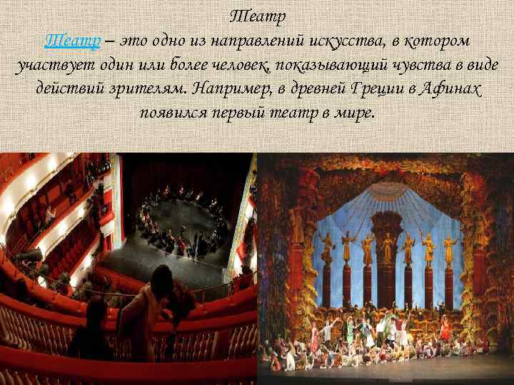 Театр – это одно из направлений искусства, в котором участвует один или более человек, показывающий чувства в виде действий зрителям. Например, в древней Греции в Афинах появился первый театр в мире.