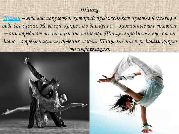 Танец – это вид искусства, который представляет чувства человека в виде движений. Не важно какие это движения – хаотичные или плавные – они передают все настроение человека. Танцы зародились еще очень давно, со времен жития древних людей. Танцами они передавали какую то информацию.