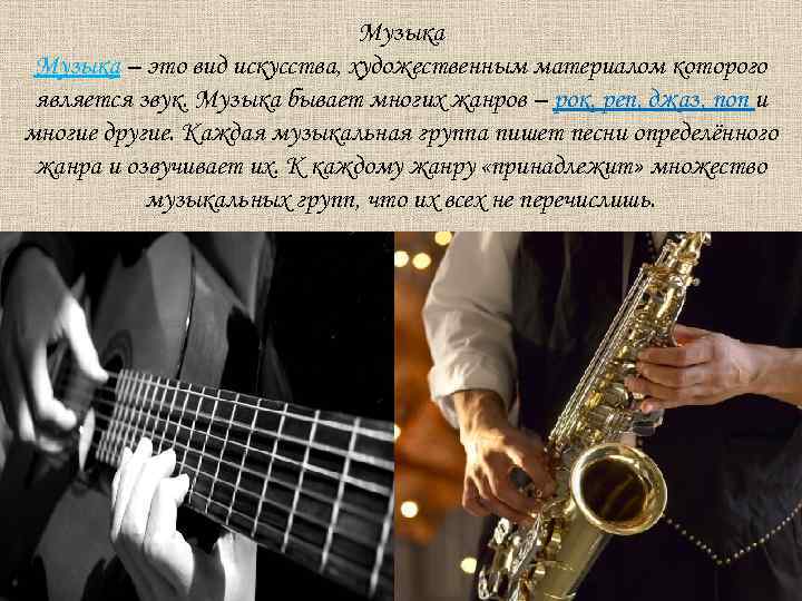 Музыка – это вид искусства, художественным материалом которого является звук. Музыка бывает многих жанров – рок, реп, джаз, поп и многие другие. Каждая музыкальная группа пишет песни определённого жанра и озвучивает их. К каждому жанру «принадлежит» множество музыкальных групп, что их всех не перечислишь.