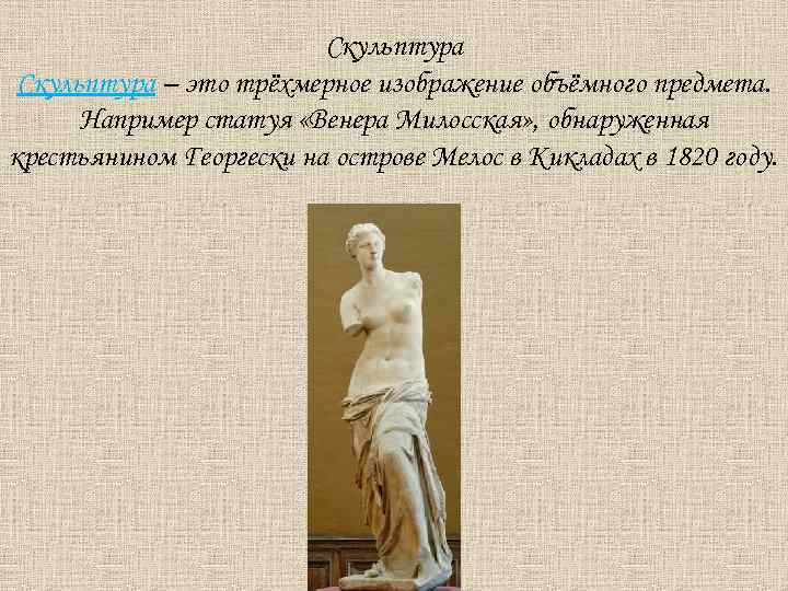 Скульптура – это трёхмерное изображение объёмного предмета. Например статуя «Венера Милосская» , обнаруженная крестьянином Георгески на острове Мелос в Кикладах в 1820 году.