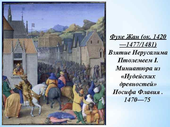 Фуке Жан (ок. 1420 — 1477/1481) Взятие Иерусалима Птолемеем I. Миниатюра из «Иудейских древностей» Иосифа Флавия. 1470— 75