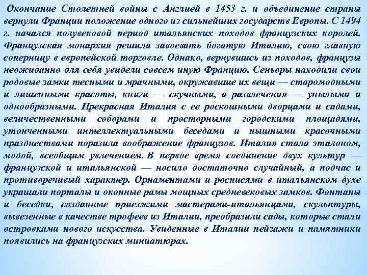 Окончание Столетней войны с Англией в 1453 г. и объединение страны вернули Франции положение одного из сильнейших государств Европы. С 1494 г. начался полувековой период итальянских походов французских королей. Французская монархия решила завоевать богатую Италию, свою главную соперницу в европейской торговле. Однако, вернувшись из походов, французы неожиданно для себя увидели совсем иную Францию. Сеньоры находили свои родовые замки тесными и мрачными, окружавшие их вещи — старомодными и лишенными красоты, книги — скучными, а развлечения — унылыми и однообразными. Прекрасная Италия с ее роскошными дворцами и садами, величественными соборами и просторными городскими площадями, утонченными интеллектуальными беседами и пышными красочными празднествами поразила воображение французов. Италия стала эталоном, модой, всеобщим увлечением. В первое время соединение двух культур — французской и итальянской — носило достаточно случайный, а подчас и противоречивый характер. Орнаментами и росписями в итальянском духе украшали порталы и оконные рамы мощных средневековых замков. Фонтаны и беседки, созданные приезжими мастерами-итальянцами, скульптуры, вывезенные в качестве трофеев из Италии, преобразили сады, которые стали островками нового искусства. Увиденные в Италии пейзажи и памятники появились на французских миниатюрах.