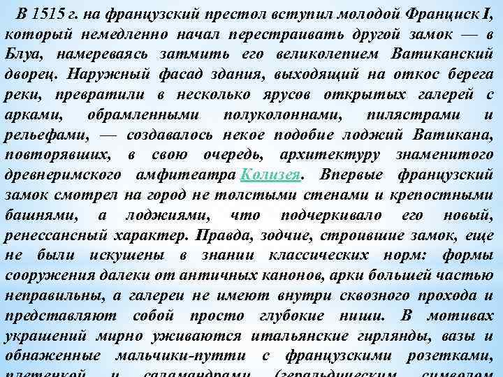 В 1515 г. на французский престол вступил молодой Франциск I, который немедленно начал перестраивать другой замок — в Блуа, намереваясь затмить его великолепием Ватиканский дворец. Наружный фасад здания, выходящий на откос берега реки, превратили в несколько ярусов открытых галерей с арками, обрамленными полуколоннами, пилястрами и рельефами, — создавалось некое подобие лоджий Ватикана, повторявших, в свою очередь, архитектуру знаменитого древнеримского амфитеатра Колизея. Впервые французский замок смотрел на город не толстыми стенами и крепостными башнями, а лоджиями, что подчеркивало его новый, ренессансный характер. Правда, зодчие, строившие замок, еще не были искушены в знании классических норм: формы сооружения далеки от античных канонов, арки большей частью неправильны, а галереи не имеют внутри сквозного прохода и представляют собой просто глубокие ниши. В мотивах украшений мирно уживаются итальянские гирлянды, вазы и обнаженные мальчики-путти с французскими розетками,