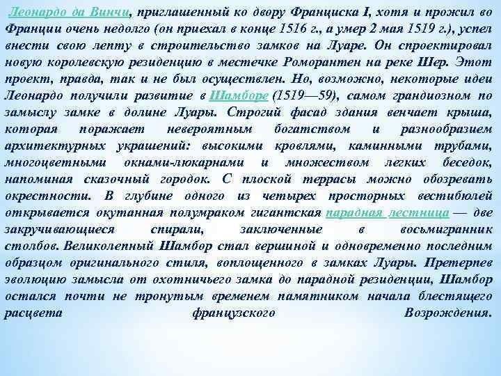 Леонардо да Винчи, приглашенный ко двору Франциска I, хотя и прожил во Франции очень недолго (он приехал в конце 1516 г. , а умер 2 мая 1519 г. ), успел внести свою лепту в строительство замков на Луаре. Он спроектировал новую королевскую резиденцию в местечке Роморантен на реке Шер. Этот проект, правда, так и не был осуществлен. Но, возможно, некоторые идеи Леонардо получили развитие в Шамборе (1519— 59), самом грандиозном по замыслу замке в долине Луары. Строгий фасад здания венчает крыша, которая поражает невероятным богатством и разнообразием архитектурных украшений: высокими кровлями, каминными трубами, многоцветными окнами-люкарнами и множеством легких беседок, напоминая сказочный городок. С плоской террасы можно обозревать окрестности. В глубине одного из четырех просторных вестибюлей открывается окутанная полумраком гигантская парадная лестница — две закручивающиеся спирали, заключенные в восьмигранник столбов. Великолепный Шамбор стал вершиной и одновременно последним образцом оригинального стиля, воплощенного в замках Луары. Претерпев эволюцию замысла от охотничьего замка до парадной резиденции, Шамбор остался почти не тронутым временем памятником начала блестящего расцвета французского Возрождения.