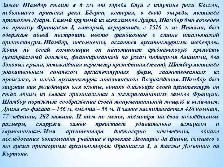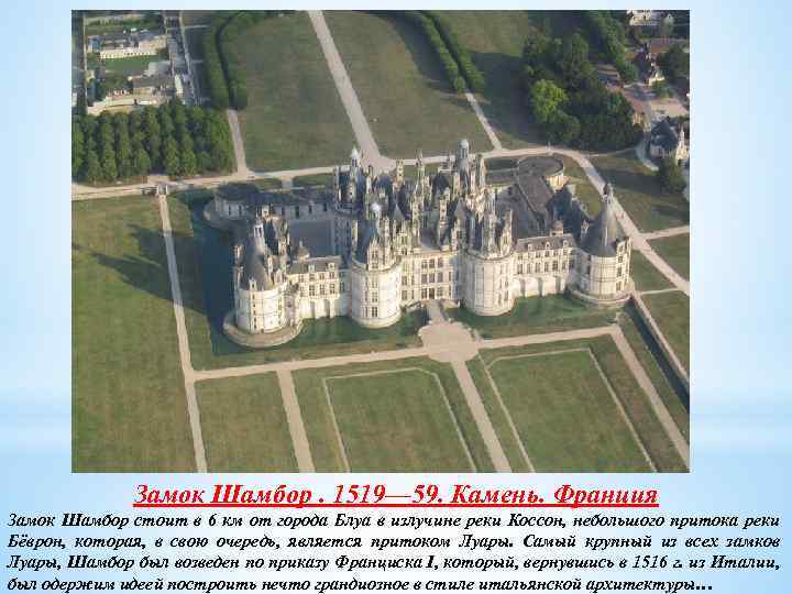 Замок Шамбор стоит в 6 км от города Блуа в излучине реки Коссон, небольшого притока реки Бёврон, которая, в свою очередь, является притоком Луары. Самый крупный из всех замков Луары, Шамбор был возведен по приказу Франциска I, который, вернувшись в 1516 г. из Италии, был одержим идеей построить нечто грандиозное в стиле итальянской архитектуры. Шамбор, несомненно, является архитектурным шедевром. Хотя по своей композиции он напоминает средневековую крепость (центральный донжон, фланкированный по углам четырьмя башнями, два боковых крыла, замыкающая периметр крепостная стена), Шамбор является удивительным синтезом архитектурных форм, заимствованных из прошлого, и новой архитектуры итальянского Возрождения. Шамбор был задуман как резиденция для охоты, однако благодаря своей архитектуре он стал одним из самых оригинальных и экстравагантных замков Франции. Шамбор поражает воображение своей монументальной мощью и величием. Длина его фасада – 156 м, высота – 56 м. В замке насчитывается 426 комнат, 77 лестниц, 282 камина. И тем не менее, несмотря на свои колоссальные размеры, снаружи замок предстает удивительно изящным и гармоничным. Имя архитектора достоверно неизвестно, однако исследования доказывают участие в проекте Леонардо да Винчи, бывшего в то время придворным архитектором Франциска I, а также Доменико да Кортона.