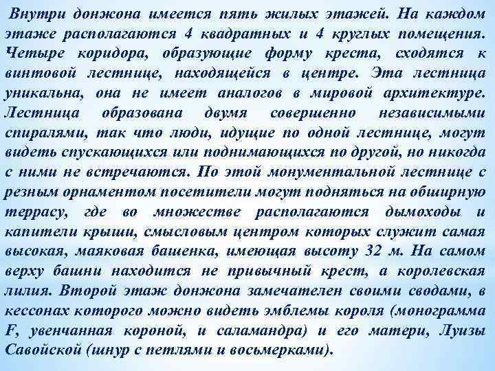 Внутри донжона имеется пять жилых этажей. На каждом этаже располагаются 4 квадратных и 4 круглых помещения. Четыре коридора, образующие форму креста, сходятся к винтовой лестнице, находящейся в центре. Эта лестница уникальна, она не имеет аналогов в мировой архитектуре. Лестница образована двумя совершенно независимыми спиралями, так что люди, идущие по одной лестнице, могут видеть спускающихся или поднимающихся по другой, но никогда с ними не встречаются. По этой монументальной лестнице с резным орнаментом посетители могут подняться на обширную террасу, где во множестве располагаются дымоходы и капители крыши, смысловым центром которых служит самая высокая, маяковая башенка, имеющая высоту 32 м. На самом верху башни находится не привычный крест, а королевская лилия. Второй этаж донжона замечателен своими сводами, в кессонах которого можно видеть эмблемы короля (монограмма F, увенчанная короной, и саламандра) и его матери, Луизы Савойской (шнур с петлями и восьмерками).