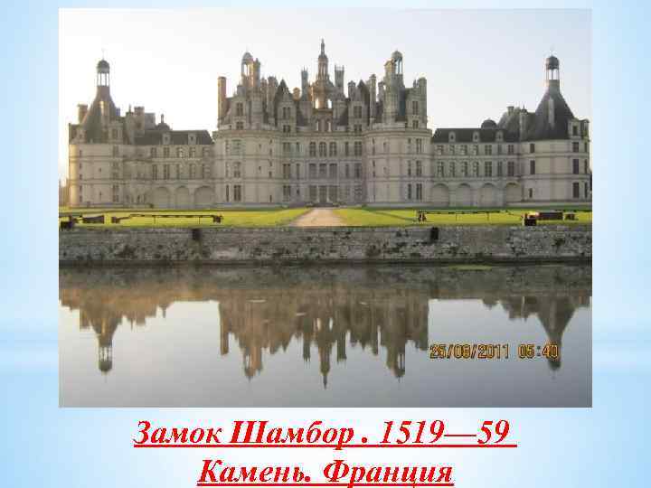 Замок Шамбор. 1519— 59. Камень. Франция Замок Шамбор стоит в 6 км от города Блуа в излучине реки Коссон, небольшого притока реки Бёврон, которая, в свою очередь, является притоком Луары. Самый крупный из всех замков Луары, Шамбор был возведен по приказу Франциска I, который, вернувшись в 1516 г. из Италии, был одержим идеей построить нечто грандиозное в стиле итальянской архитектуры…