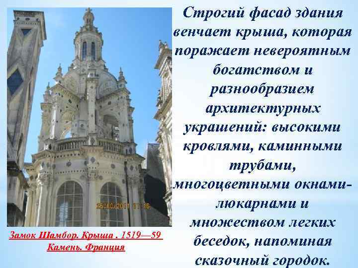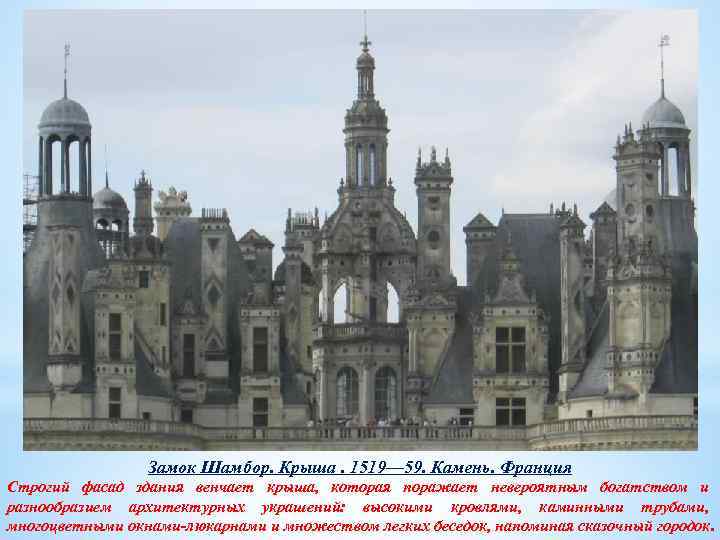 Замок Шамбор. Крыша. 1519— 59 Камень. Франция Строгий фасад здания венчает крыша, которая поражает невероятным богатством и разнообразием архитектурных украшений: высокими кровлями, каминными трубами, многоцветными окнамилюкарнами и множеством легких беседок, напоминая сказочный городок.