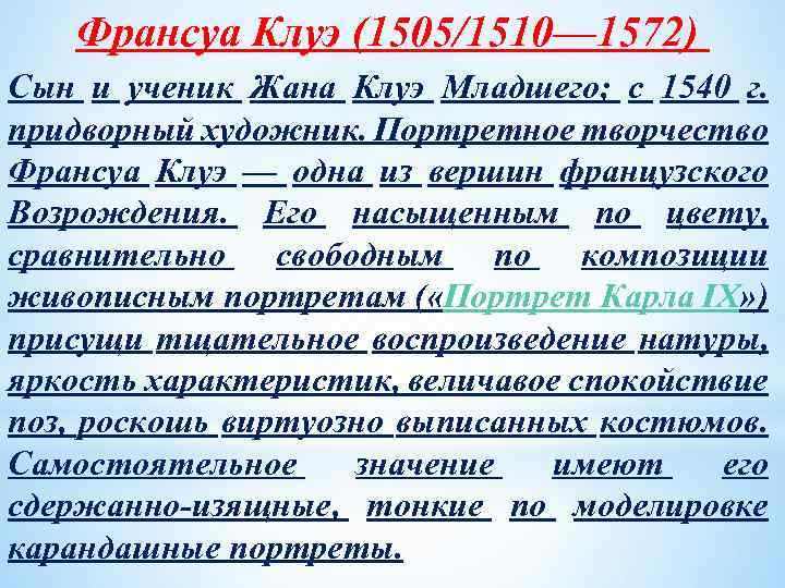 Франсуа Клуэ (1505/1510— 1572) Сын и ученик Жана Клуэ Младшего; с 1540 г. придворный художник. Портретное творчество Франсуа Клуэ — одна из вершин французского Возрождения. Его насыщенным по цвету, сравнительно свободным по композиции живописным портретам ( «Портрет Карла IX» ) присущи тщательное воспроизведение натуры, яркость характеристик, величавое спокойствие поз, роскошь виртуозно выписанных костюмов. Самостоятельное значение имеют его сдержанно-изящные, тонкие по моделировке карандашные портреты.