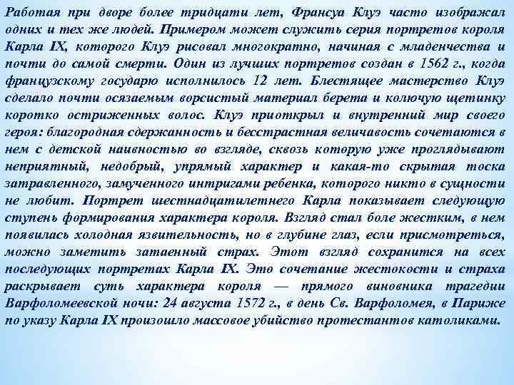 Работая при дворе более тридцати лет, Франсуа Клуэ часто изображал одних и тех же людей. Примером может служить серия портретов короля Карла IX, которого Клуэ рисовал многократно, начиная с младенчества и почти до самой смерти. Один из лучших портретов создан в 1562 г. , когда французскому государю исполнилось 12 лет. Блестящее мастерство Клуэ сделало почти осязаемым ворсистый материал берета и колючую щетинку коротко остриженных волос. Клуэ приоткрыл и внутренний мир своего героя: благородная сдержанность и бесстрастная величавость сочетаются в нем с детской наивностью во взгляде, сквозь которую уже проглядывают неприятный, недобрый, упрямый характер и какая-то скрытая тоска затравленного, замученного интригами ребенка, которого никто в сущности не любит. Портрет шестнадцатилетнего Карла показывает следующую ступень формирования характера короля. Взгляд стал боле жестким, в нем появилась холодная язвительность, но в глубине глаз, если присмотреться, можно заметить затаенный страх. Этот взгляд сохранится на всех последующих портретах Карла IX. Это сочетание жестокости и страха раскрывает суть характера короля — прямого виновника трагедии Варфоломеевской ночи: 24 августа 1572 г. , в день Св. Варфоломея, в Париже по указу Карла IX произошло массовое убийство протестантов католиками.