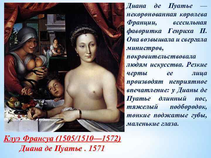 Диана де Пуатье — некоронованная королева Франции, всесильная фаворитка Генриха II. Она возвышала и свергала министров, покровительствовала людям искусства. Резкие черты ее лица производят неприятное впечатление: у Дианы де Пуатье длинный нос, тяжелый подбородок, тонкие поджатые губы, маленькие глаза. Клуэ Франсуа (1505/1510— 1572) Диана де Пуатье. 1571