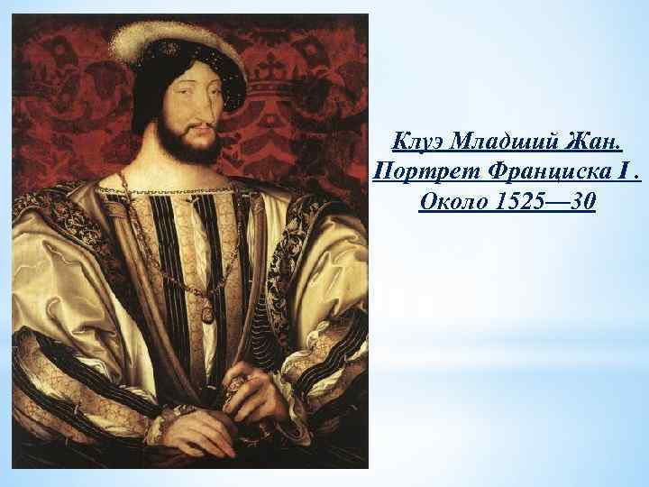 Начиная с 1515 г. при дворе Франциска I работал живописец Жан Клуэ Младший (ок. 1475— 1540/1541), знаменитый мастер живописного и карандашного портрета. Художник создал целую галерею портретов современников: самого короля, его соратников — участников итальянских походов, известных придворных красавиц и т. д. Линии карандашных портретов Жана Клуэ скупы и просты. Художник подробно прорабатывал только лицо; головной убор, прическу, костюм он часто намечал одной-двумя линиями. В этой простоте заключается особое обаяние портретов Клуэ. Его интересовал лишь сам человек — его сущность. Жан Клуэ и его сын Франсуа Клуэ (ок. 1505— 1572), ставший после смерти отца главным портретистом французского двора, запечатлели практически всех действующих лиц французской истории XVI в. : королей Франциска I и Карла IX, знаменитых красавиц мадам де Летранж, мадам де Лотрек, герцогиню д’Этамп, фаворитку Генриха II Диану де Пуатье. Портреты, выполненные Франсуа Клуэ, отличаются по технике от работ его отца. Клуэ-сын много внимания уделял деталям костюма, передаче фактуры разнообразных материалов. Его характеристики остры и точны, они раскрывают человека гораздо полнее и глубже, чем все исследования историков.