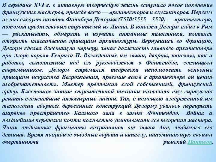 В середине XVI в. в активную творческую жизнь вступило новое поколение французских мастеров, прежде всего — архитекторов и скульпторов. Первым из них следует назвать Филибера Делорма (1510/1515— 1570) — архитектора, потомка средневековых строителей из Лиона. В юности Делорм ездил в Рим — раскапывать, обмерять и изучать античные памятники, пытаясь открыть классические принципы архитектуры. Вернувшись во Францию, Делорм сделал блестящую карьеру, заняв должность главного архитектора при дворе короля Генриха II. Возведенные им замки, дворцы, капеллы, как и работы, выполненные под его руководством в Фонтенбло, восхищали современников. Делорм стремился творчески использовать основные принципы искусства Возрождения, превыше всего в архитекторе он ценил изобретательность. Мастер предложил свой собственный, французский ордер. Блестящее знание строительной техники позволило ему виртуозно решать сложнейшие инженерные задачи. Так, с помощью изобретенной им технологии сборных деревянных конструкций Делорму удалось перекрыть широкое пространство Бального зала в замке Фонтенбло. Войны и позднейшие переделки почти полностью уничтожили все творения мастера. Лишь отдельные фрагменты сохранились от замка Ане, любимого его детища. Время пощадило въездные ворота и капеллу, напоминающую своими очертаниями римский Пантеон.