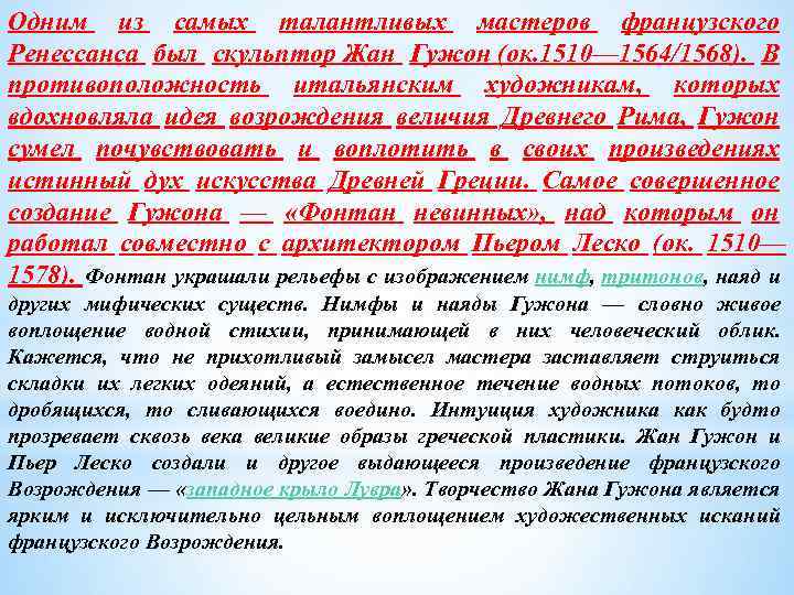 Одним из самых талантливых мастеров французского Ренессанса был скульптор Жан Гужон (ок. 1510— 1564/1568). В противоположность итальянским художникам, которых вдохновляла идея возрождения величия Древнего Рима, Гужон сумел почувствовать и воплотить в своих произведениях истинный дух искусства Древней Греции. Самое совершенное создание Гужона — «Фонтан невинных» , над которым он работал совместно с архитектором Пьером Леско (ок. 1510— 1578). Фонтан украшали рельефы с изображением нимф, тритонов, наяд и других мифических существ. Нимфы и наяды Гужона — словно живое воплощение водной стихии, принимающей в них человеческий облик. Кажется, что не прихотливый замысел мастера заставляет струиться складки их легких одеяний, а естественное течение водных потоков, то дробящихся, то сливающихся воедино. Интуиция художника как будто прозревает сквозь века великие образы греческой пластики. Жан Гужон и Пьер Леско создали и другое выдающееся произведение французского Возрождения — «западное крыло Лувра» . Творчество Жана Гужона является ярким и исключительно цельным воплощением художественных исканий французского Возрождения.