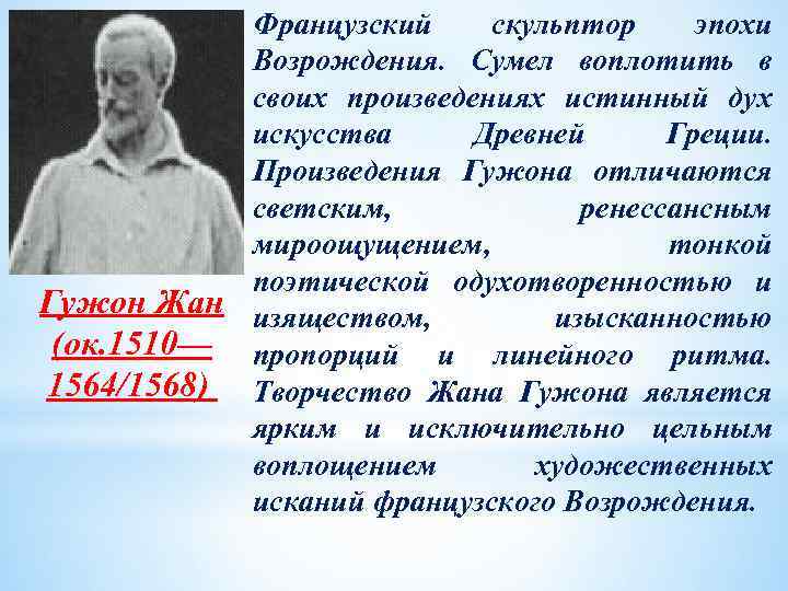 Французский скульптор эпохи Возрождения. Сумел воплотить в своих произведениях истинный дух искусства Древней Греции. Произведения Гужона отличаются светским, ренессансным мироощущением, тонкой поэтической одухотворенностью и Гужон Жан изяществом, изысканностью (ок. 1510— пропорций и линейного ритма. 1564/1568) Творчество Жана Гужона является ярким и исключительно цельным воплощением художественных исканий французского Возрождения.