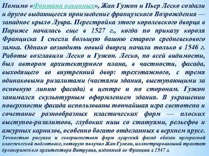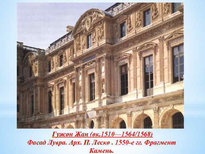 Помимо «Фонтана невинных» , Жан Гужон и Пьер Леско создали и другое выдающееся произведение французского Возрождения — западное крыло Лувра. Перестройка этого королевского дворца в Париже началась еще в 1527 г. , когда по приказу короля Франциска I снесли большую башню старого средневекового замка. Однако возводить новый дворец начали только в 1546 г. Работы возглавили Леско и Гужон. Леско, по всей видимости, был автором архитектурного плана, в частности, фасада, выходящего во внутренний двор: трехэтажного, с тремя одинаковыми ризалитами (частями здания, выступающими за основную линию фасада) в центре и по сторонам. Гужон занимался скульптурным оформлением здания. В украшении поверхности фасада использованы тончайшая игра светотени и сочетание разнообразных пластических форм — плоских выступов-ризалитоов, глубоких ниш со статуями, рельефов и ажурных карнизов, особенно богато отделанных в верхнем ярусе. Точностью рисунка и совершенством форм луврский фасад обязан прекрасной классической подготовке, которую получил Жан Гужон, иллюстрировавший трактат древнеримского архитектора Витрувия, изданный во Франции в 1547 г.