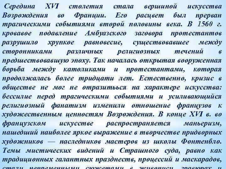 Середина XVI столетия стала вершиной искусства Возрождения во Франции. Его расцвет был прерван трагическими событиями второй половины века. В 1560 г. кровавое подавление Амбуазского заговора протестантов разрушило хрупкое равновесие, существовавшее между сторонниками различных религиозных течений в предшествовавшую эпоху. Так началась открытая вооруженная борьба между католиками и протестантами, которая продолжалась более тридцати лет. Естественно, кризис в обществе не мог не отразитьься на характере искусства: бессилие перед трагическими событиями и усиливающийся религиозный фанатизм изменили отношение французов к художественным ценностям Возрождения. В конце XVI в. во французском искусстве распространяется маньеризм, нашедший наиболее яркое выражение в творчестве придворных художников — наследников мастеров из школы Фонтенбло. Темы мистических видений и Страшного суда, равно как традиционных галантных празднеств, процессий и маскарадов,