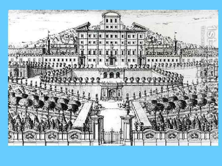 • Складывается система итальянского парка: наличие единой оси парка, расположенного на склоне горы с многочисленными спусками , террасами гротами. • На этой же оси расположено и главное здание.