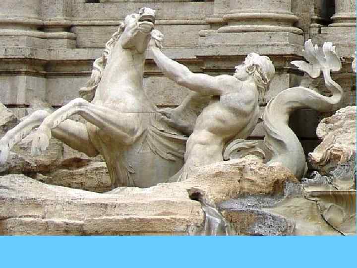 • «Укрощение вод» – тема скульптурной композиции. • Тритоны направляют колесницу из морских раковин Посейдона, которую влекут гиппокампы – водяные лошади.