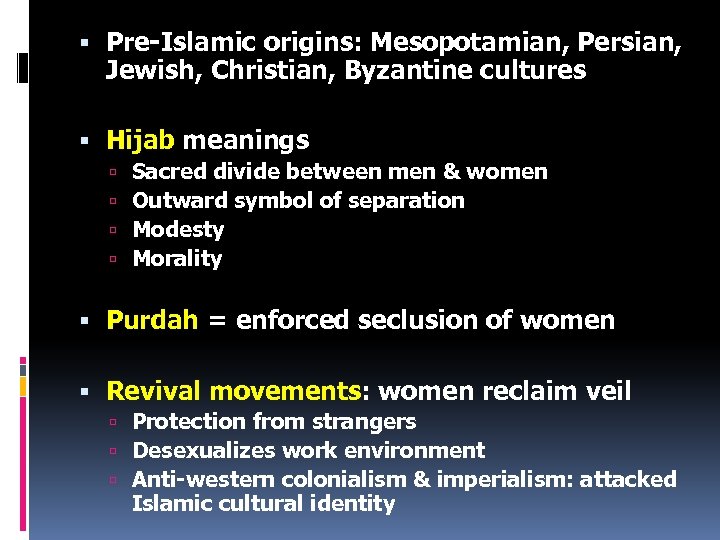 Pre-Islamic origins: Mesopotamian, Persian, Jewish, Christian, Byzantine cultures Hijab meanings Sacred divide between men & women Outward symbol of separation Modesty Morality Purdah = enforced seclusion of women Revival movements: women reclaim veil Protection from strangers Desexualizes work environment Anti-western colonialism & imperialism: attacked Islamic cultural identity