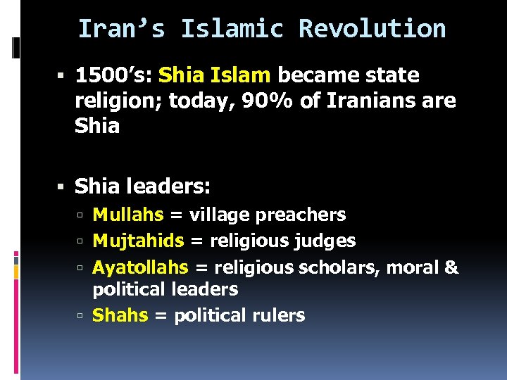 Iran’s Islamic Revolution 1500’s: Shia Islam became state religion; today, 90% of Iranians are Shia leaders: Mullahs = village preachers Mujtahids = religious judges Ayatollahs = religious scholars, moral & political leaders Shahs = political rulers