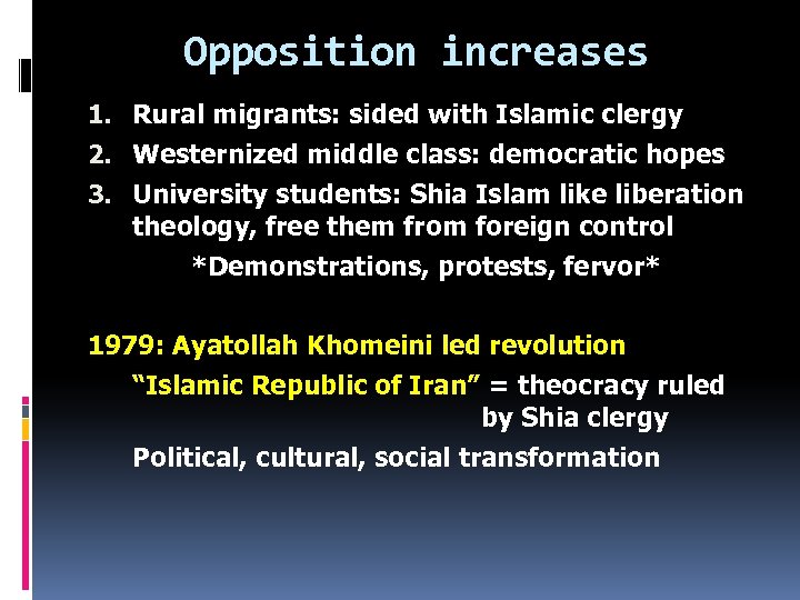 Opposition increases 1. Rural migrants: sided with Islamic clergy 2. Westernized middle class: democratic hopes 3. University students: Shia Islam like liberation theology, free them from foreign control *Demonstrations, protests, fervor* 1979: Ayatollah Khomeini led revolution “Islamic Republic of Iran” = theocracy ruled by Shia clergy Political, cultural, social transformation