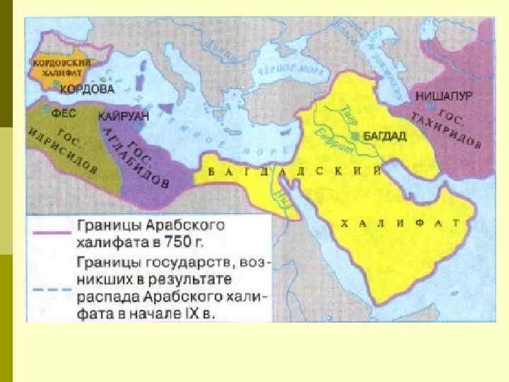 Аббасидский халифат (750— 1258) постепенный распад государства (возникновение Кордовского халифата на Пиренейском полуострове, 8 веков Реконкисты – до 1492 г. ). p «Золотой век» арабской культуры: богатые библиотеки, придворный этикет, искусство каллиграфии, десятичная система счисления, изобретение нуля, магнитная игла, механические часы, хлопчатая, а затем льняная бумага. p
