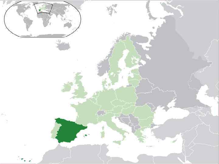 Испа ния, официально — Короле вство Испа ния — государство на юго-западе Европы со столицей в городе Мадрид. Испания занимает бо льшую часть Пиренейского полуострова. Согласно одной из версий, название страны происходит от финикийского выражения «и-шпаним» — «берег даманов» . Занимает 4/5 территории Иберийского полуострова, Канарские и Балеарские острова общей площадью 504 782 км² (вместе с небольшими суверенными территориями на африканском побережье, городами Сеута и Мелилья), являясь четвёртой по величине страной в Европе после России, Украины и Франции. Средняя высота поверхности Испании 650 метров над уровнем моря. Страна является одной из самых гористых стран Европы. Граничит с: • Португалией на западе Пиренейского полуострова; • Британским владением Гибралтар на юге Иберийского полуострова; • Марокко в северной Африке (полуанклавы Сеута и Мелилья); • Францией и Андоррой на севере. Испания омывается Атлантическим океаном на севере и западе, а также Средиземным морем на юге и востоке. Национальный праздник в Испании — День испанской нации, ежегодно отмечается 12 октября.