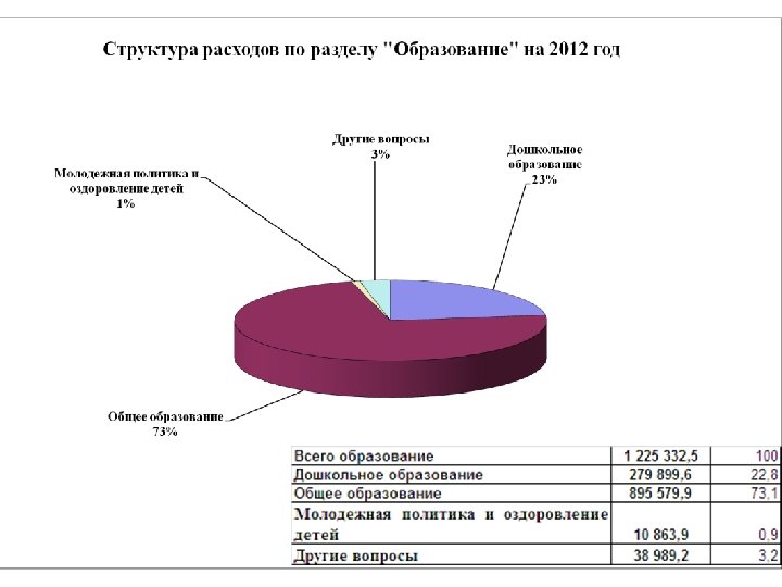 Структура расходной части бюджета по отраслям на 2012 год Физическая культура и спорт 3. 4% Обслуживание муниципального Общегосударственные вопросы долга 0. 0% 4. 7% Социальная политика 5. 5% Межбюджетные трансферты 11. 3% Национальная оборона 0. 1% Национальная безопасность и правоохранит. деятельность 0. 1% Национальная экономика 13. 4% Общегосударственн ые вопросы Национальная оборона Национальная безопасность и правоохранит. деятельность Национальная экономика Жилищнокоммунальное хозяйство 108 324, 16 Охрана окружающей среды Образование 3, 84 1 844, 37 3 077, 77 308 547, 78 84 681, 86 1 225 332, 53 Культура Здравоохранение 0. 5% Жилищно-коммунальное хозяйство 3. 7% Культура 3. 8% Образование 53. 4% Охрана окружающей среды 0. 0% 87 310, 65 Здравоохранение 11 638, 02 Социальная политика Физическая культура и спорт Обслуживание муниципального долга 127 263, 64 Межбюджетные трансферты Итого расходов 258 468, 00 78 978, 38 224, 27 2 295 695, 27